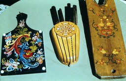 Slide GN1. Folk painting by Mrs. Mary Vanson (Red Deer, AB). Rosemaling on wooden kitchen items. Scandinavian folk art decorative painting that originated in Norway. Ethnicity: Norwegian. |